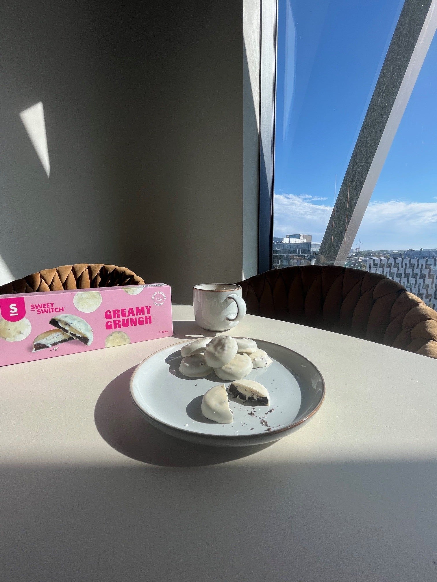 white chocolate 27% (sweetener: maltitol, vegetable fat: coconut, whole milk, skimmed milk, emulsifier: soy lecithin, natural vanilla aroma), milk flavour cream 25% (sweetener: maltitol, vegetable fat: coconut, whey powder (milk), skimmed milk, natural vanilla aroma), wheat flour, vegetable fat (coconut, rapeseed), sweetener: maltitol, reduced fat cocoa, raising agent: sodium bicarbonate.